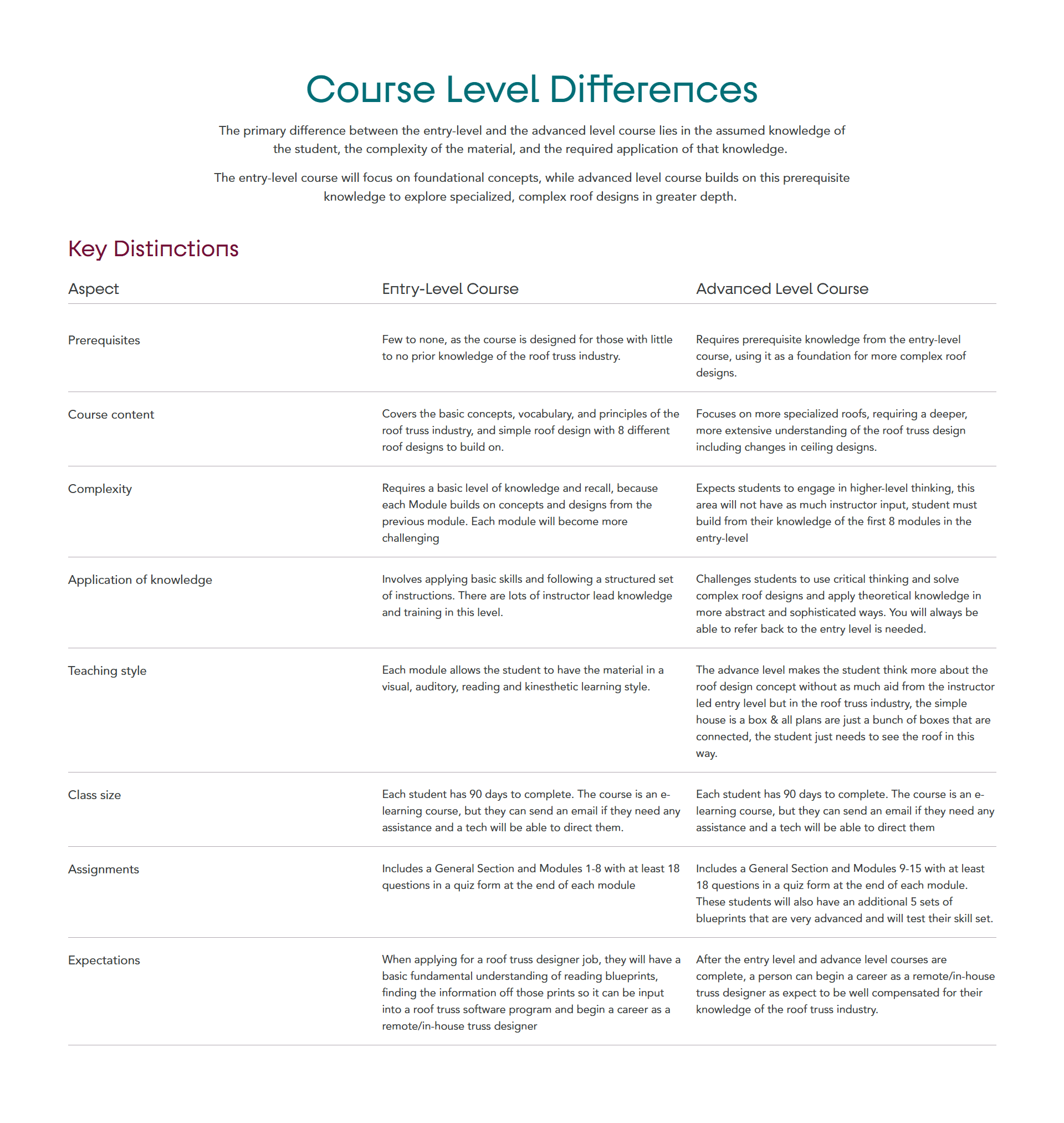 The entry-level course will focus on foundational concepts, while advanced level course builds on this prerequisite knowledge to explore specialized, complex roof designs in greater depth.